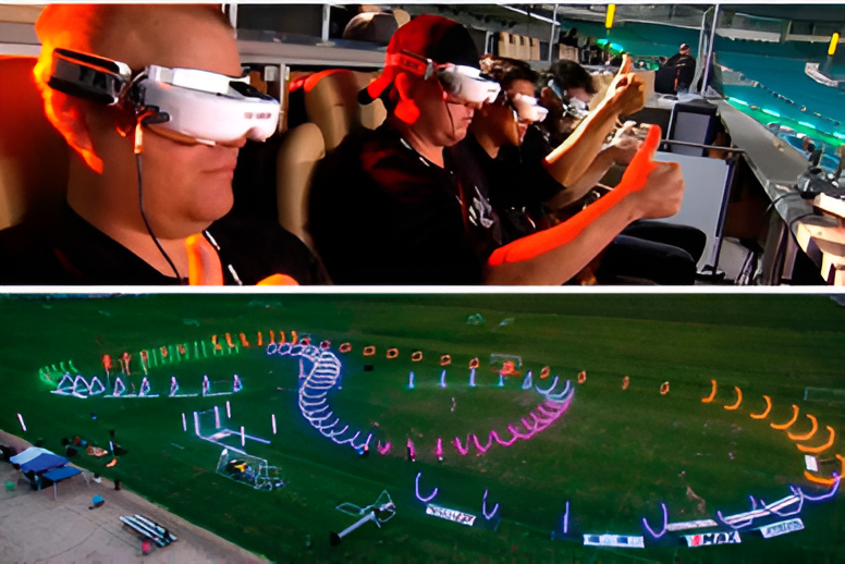 - Las carreras de drones F.P.V. (más conocidos por sus siglas First Person View) consisten en completar un circuito lo más rápido posible, con drones equipados con cámaras capaces de transmitir las imágenes a las gafas F.P.V. que tiene el piloto desde el puesto de mando.
